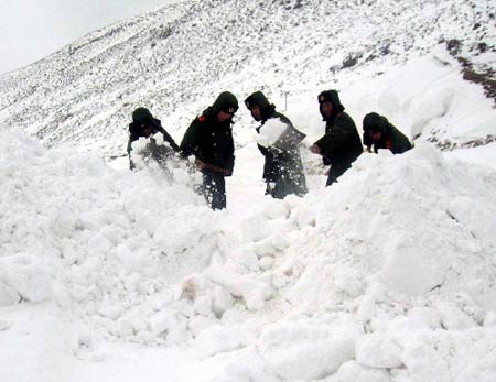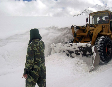 受持續(xù)強(qiáng)降雪和雪崩影響,川藏公路西藏境內(nèi)東達(dá)山至牛踏溝部分路段交通中斷。擔(dān)負(fù)川藏公路竹東段養(yǎng)護(hù)保通任務(wù)的武警交通部隊(duì)緊急啟動搶險(xiǎn)預(yù)案,出動機(jī)車、兵力趕赴受災(zāi)現(xiàn)場全力搶通道路。 新華社記者 葉輝 攝