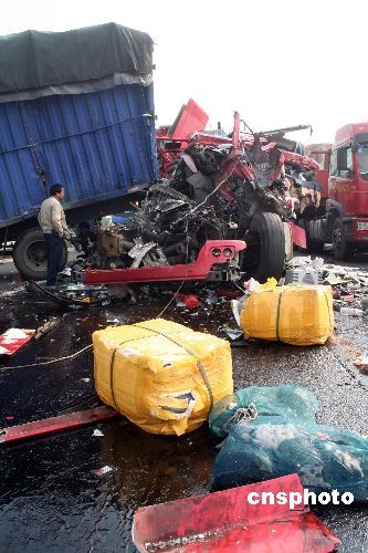 11月14日6時30分,由于受團霧影響,滬昆高速江西東鄉(xiāng)縣195KM--196KM處往南昌方向同時間發(fā)生5起汽車追尾事故,造成16輛貨車追尾,高速公路交通一度受阻。據(jù)了解,事故已造成5人死亡、10人受傷。經(jīng)過當(dāng)?shù)赜嘘P(guān)部門全力搶救,到上午10時,滬昆高速公路事故路段實行交通疏導(dǎo)分流,恢復(fù)部分交通,目前事故還在進(jìn)一步清理調(diào)查中。中新社發(fā) 何江華 攝