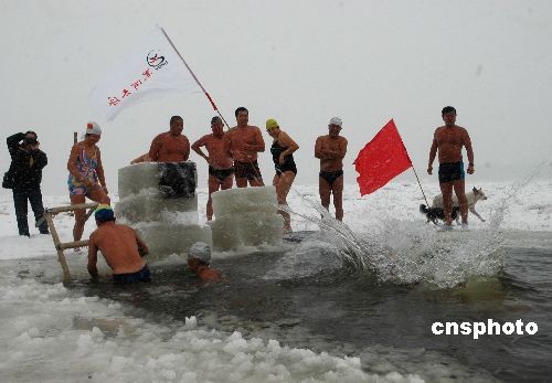 11月15日,在黑龍江黑河冬泳俱樂部成立十周年來(lái)臨之際,黑河市冬泳俱樂部會(huì)員與該市攝影家協(xié)會(huì)會(huì)員齊聚黑龍江邊。冬泳俱樂部會(huì)員們冒雪表演了精彩的跳水、蝶泳、自由泳、水上漂等項(xiàng)目,向國(guó)內(nèi)外游客展示不畏嚴(yán)寒的勇氣。攝影家協(xié)會(huì)會(huì)員則用手中的相機(jī)記錄冬泳隊(duì)員遨游冰池,以矯健的身姿挑戰(zhàn)生命極限的場(chǎng)景。據(jù)悉,他們將聯(lián)手共同出版畫冊(cè),面向國(guó)內(nèi)外宣傳、推介黑河,擴(kuò)大黑河的知名度,積極推動(dòng)黑河旅游業(yè)的發(fā)展。中新社發(fā) 邱齊龍 攝
