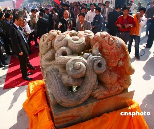 11月15日上午,毛澤東龍鈕大印啟運儀式在福建福州晉安區(qū)新店民營工業(yè)區(qū)藏天園一樓舉行。壽山石作為世界上獨有的珍貴彩石,兼具“細、結(jié)、潤、膩、溫、凝”六德,以質(zhì)地最好、品種最多、色彩最豐富、開發(fā)利用歷史最悠久、雕刻工藝最高、影響最廣泛而聞名于世,歷代帝王均以壽山石為印璽。毛澤東龍鈕大印作為新落成的毛澤東紀念館鎮(zhèn)館之寶。該印重達5噸,寬度為1150毫米,寓意毛澤東今年誕辰為115周年,印章高為1226毫米寓意毛澤東出生時間12月26日,整個印章為一塊完整壽山原石雕刻而成。該原石由一個30多噸重的壽山石胚,由幾十名藏天園工藝師經(jīng)過一個多月日夜雕刻而成。中新社發(fā) 祝敏松 攝