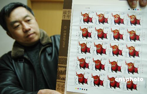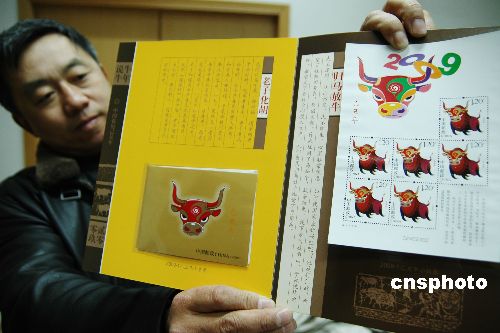 2009年1月4日,即將發(fā)行的《己丑年》特種郵票運抵蘇州。據悉,國家郵政局和中國郵政集團公司將于1月5日在蘇州首發(fā)該套以“奔牛”為形象的《己丑年》特種郵票。該次發(fā)行的《己丑年》郵票一套一枚,面值1.2元。郵票圖案為健壯倔強的奔牛形象,表現出奮力向前的視覺效果,寓意人們對生肖牛年的期望與寄托。中新社發(fā) 朱子寒 攝