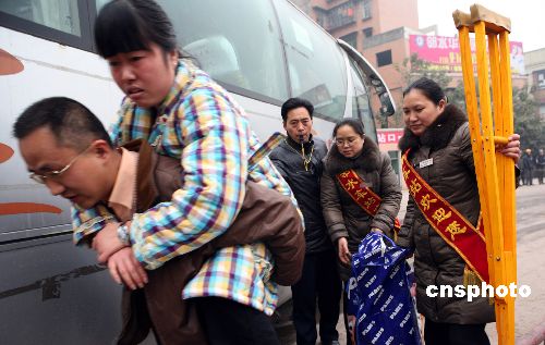 2009年1月17日,四川廣安市鄰水汽車站的服務(wù)人員在熱情幫助病殘旅客上車。春運(yùn)以來,四川廣安市各級客運(yùn)部門以構(gòu)建和諧春運(yùn)為宗旨,在細(xì)節(jié)和過程服務(wù)上下功夫,安排專門的工作人員在售票大廳、候車室及旅客上、下車區(qū)域主動為旅客提供服務(wù),深受旅客歡迎。中新社發(fā) 邱海鷹 攝