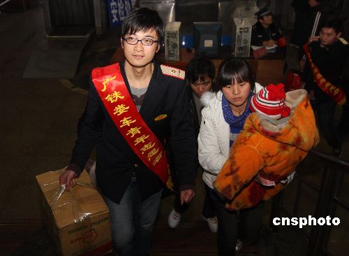 1月29日,湖南省婁底車(chē)務(wù)段的青年志愿者在婁底火車(chē)站為攜帶許多行李等老弱病殘等旅客提供各種幫助。當(dāng)日,湖南省婁底火車(chē)站迎來(lái)節(jié)后返程客流小高峰,婁底車(chē)務(wù)段團(tuán)委組織近千名團(tuán)員青年志愿者開(kāi)展“和諧春運(yùn)”活動(dòng),在管區(qū)內(nèi)的車(chē)站設(shè)立了被旅客稱(chēng)為“愛(ài)心島”的青年志愿者服務(wù)站,為旅客提供溫馨服務(wù)。中新社發(fā) 郭國(guó)權(quán) 攝