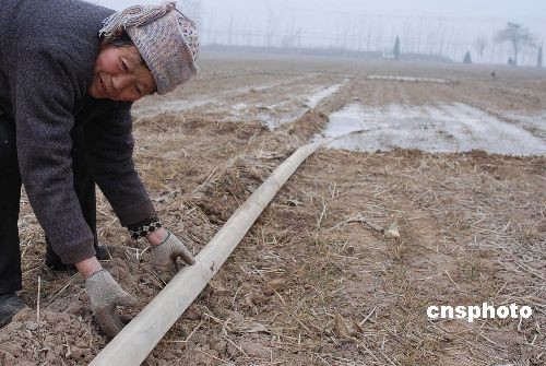 2009年2月4日,山西小麥產(chǎn)地運(yùn)城新絳縣農(nóng)民在全力以赴進(jìn)行抗旱工作。入冬后,山西省受旱面積達(dá)3274萬(wàn)畝,其中山西小麥主產(chǎn)區(qū)運(yùn)城、臨汾兩地農(nóng)作物受旱面積達(dá)634萬(wàn)畝,同時(shí)有106萬(wàn)群眾及19萬(wàn)頭牲畜出現(xiàn)飲水難問(wèn)題。2月3日,山西省政府防汛抗旱指揮部已發(fā)布干旱橙色預(yù)警(Ⅱ級(jí))并啟動(dòng)響應(yīng)行動(dòng)。山西省財(cái)政緊急下?lián)芸购蒂Y金1000萬(wàn)元。中新社發(fā) 高新生 攝
