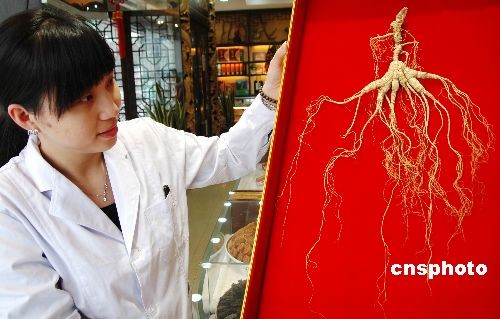 2009年2月5日,一株重約80克、售價(jià)高達(dá)100萬(wàn)元的“天價(jià)”野山參王亮相蘇州南春堂藥鋪。據(jù)了解,如此巨型人參在野山參生長(zhǎng)史上實(shí)為罕見,具有極高的收藏和藥用價(jià)值。中新社發(fā) 朱子寒 攝