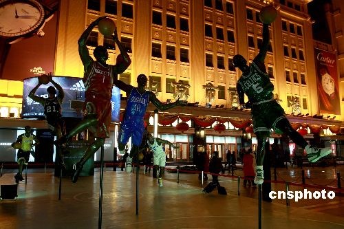 2月6日晚,“NBA全明星”現(xiàn)身北京王府井大街,吸引不少市民的目光。隨著元宵節(jié)、情人節(jié)的臨近,北京各大商家已開(kāi)始布置門(mén)面,節(jié)日商戰(zhàn)悄然打響。中新社發(fā) 鄭雄增 攝
