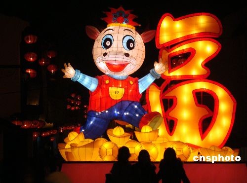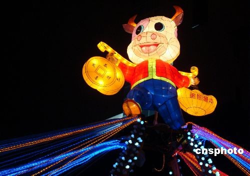 2009年2月8日消息,連日來(lái),由蘇州民間藝人趕制的卡通牛造型的姑蘇彩燈景觀陸續(xù)在鬧市街頭亮相,迎接元宵佳節(jié)的到來(lái)。中新社發(fā) 王建康 攝