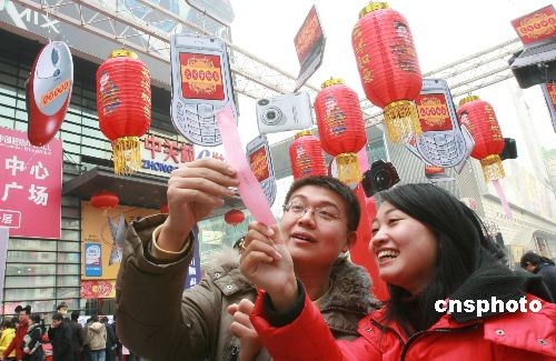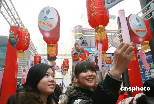 2月8日,人們在北京中關(guān)村競猜謎語。為迎接元宵佳節(jié),北京中關(guān)村舉行元宵燈謎會,用“電腦”、“相機”、“鼠標(biāo)”、“手機”等造型懸掛的燈謎,吸引了不少市民駐足猜謎。中新社發(fā) 陳曉根 攝