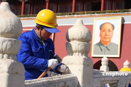2月20日,工人正在對(duì)天安門金水橋進(jìn)行修繕。為迎接新中國成立60周年,確保游客和文物安全,從2月18日起,天安門金水橋開始實(shí)施保護(hù)修繕。據(jù)天安門地區(qū)管委會(huì)介紹,工程擬于5月1日前完工,然后整體對(duì)外開放。中新社發(fā) 吳芒子 攝