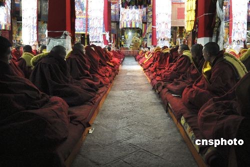 3月10日,西藏拉薩哲蚌寺,僧人們在措欽大殿誦經。中新社發(fā) 廖攀 攝