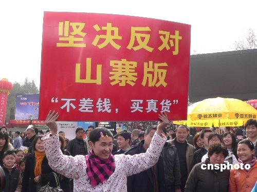 3月15日,在鄭州紫荊山廣場3·15活動(dòng)現(xiàn)場,“山寨版”小沈陽將“堅(jiān)決反對山寨版”的牌子高高舉起,倡導(dǎo)民眾買真貨。中新社發(fā) 王中舉 攝