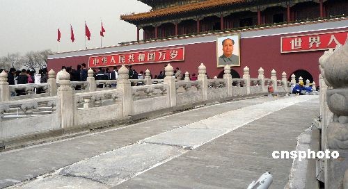 2009年3月15日,北京天安門金水橋修繕工程正在加緊進行,已經(jīng)鋪設(shè)好的青磚橋面呈現(xiàn)出修舊如舊的古韻風(fēng)姿。 據(jù)悉,天安門金水橋鋪設(shè)青磚工作完成后,將在橋上架設(shè)棧道,棧道將滿鋪木板,能夠承受游人活動等所產(chǎn)生的荷載強度等。為便于今后金水橋橋面的排水和通風(fēng),新修的棧道將架空于橋面。棧道與橋面支撐處采取彈性相接,并選擇橋面范圍以外的地方進行固定。