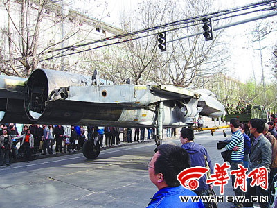 昨日(24日)下午5時許,一架被卸掉雙翼、沒有機頭的戰(zhàn)機,被一輛卡車拖著從西安火車東站拉出來,引起好奇市民的圍觀。飛機途經路段,圍觀人群擠滿了馬路。