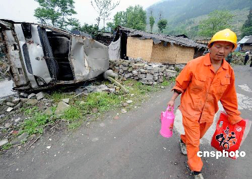 地震極重災(zāi)區(qū)映秀鎮(zhèn)將從6月3日起實施封閉重建,施工隊伍早已進(jìn)入地震遺址保護(hù)地。汶川大地震的震中映秀鎮(zhèn)幾乎被摧毀,全鎮(zhèn)1.6萬多人中,有6000多人遇難。重建的新映秀鎮(zhèn)將成為“防震減災(zāi)示范區(qū)”,民宅8度設(shè)防,學(xué)校9度抗震,確!靶≌鸩粔摹⒅姓鹂尚、大震不倒”。中新社發(fā) 賈國榮 攝