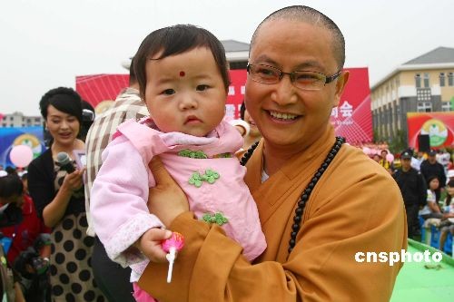5月13日,“祝福明天——四川什邡地震羅漢娃生日抓周會”在四川什邡市北京小學舉行。去年汶川大地震時,在什邡羅漢寺降生的108名嬰兒,齊聚出生地慶祝周歲生日,并參加傳統(tǒng)的抓周儀式。2008年四川地震將什邡市婦幼保健院大樓震成危房,千年古剎羅漢寺打破禁忌收留產婦和孕婦。此后的3個月中,共有108嬰兒在此降生,被人們稱為“羅漢娃”。“抓周”是在孩子周歲的時候舉行的預測前途和性情的儀式,帶有家庭游戲性質的民間習俗。中新社發(fā) 富田 攝