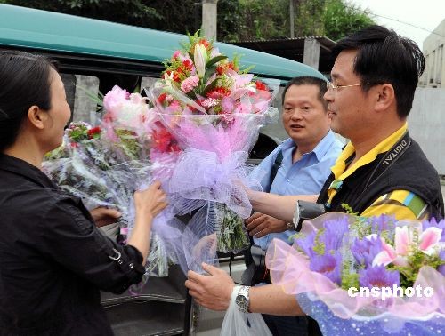 5月27日傍晚,在福州定點(diǎn)場(chǎng)所解除醫(yī)學(xué)觀察后,兩名福建省首例輸入性甲型H1N1流感確診患兒同機(jī)接觸者接受親友(左一)贈(zèng)送的鮮花。當(dāng)日,福建省衛(wèi)生廳在其網(wǎng)站上發(fā)布福建省甲型H1N1流感防控信息通報(bào),截止5月26日24:00,衛(wèi)生部通報(bào)福建省首例輸入性甲型H1N1流感確診患兒病情進(jìn)一步好轉(zhuǎn),無(wú)咳嗽及流涕,無(wú)并發(fā)癥,精神狀態(tài)良好,體溫正常,已連續(xù)3天體溫低于37℃。根據(jù)專家組的意見(jiàn),該患兒同機(jī)的30名在閩密切接觸者隔離醫(yī)學(xué)觀察期限為5月27日20時(shí)。屆時(shí)密切接觸者如無(wú)特殊情況,即按期解除醫(yī)學(xué)觀察。患兒親屬及就診過(guò)程中的8名密切接觸者將按其與患兒脫離接觸的時(shí)間起算,隔離滿7日后,陸續(xù)解除醫(yī)學(xué)觀察。中新社發(fā) 劉可耕 攝