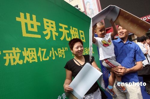 5月29日,一個家庭在北京王府井大街將香煙模型撅斷,這是由北京市愛衛(wèi)會主辦的世界無煙日暨“戒煙億小時”公益活動現(xiàn)場。該活動發(fā)出“戒煙一小時,健康億人行”的戒煙口號,號召“世界無煙日”(5月31日)當天17點31分至18點31分之間戒煙一小時。據(jù)悉,中國是世界上煙草生產(chǎn)和消費第一大國,目前約有3.5億吸煙者,并且還在以每年300萬的速度增長,控煙形勢極為嚴峻。中新社發(fā) 張宇 攝