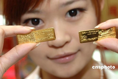 7月13日,國(guó)博版“建國(guó)60周年紀(jì)念金條”在北京宣布上市。圖為工作人員展示該套金條。產(chǎn)品每套含兩根25克Au9999金條,第一根金條主圖案選用了著名女?dāng)z影家候波1949年拍攝、現(xiàn)存唯一的《開國(guó)大典》正面原景歷史照片,記錄了毛澤東向世界宣告新中國(guó)成立的經(jīng)典瞬間。第二根金條主圖案選用了北京市民曹連弟2009年拍攝的《天安門》照片,從普通市民視角反映了舉國(guó)同慶的歷史場(chǎng)景。中新社發(fā) 鄒憲 攝