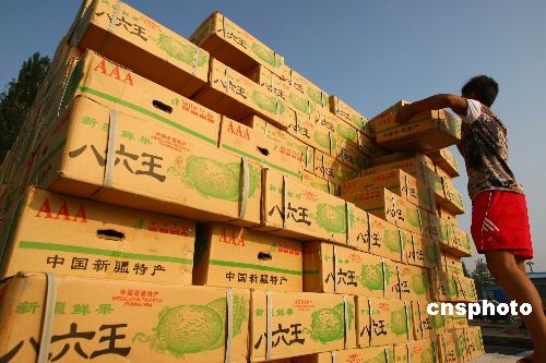 7月24日,新疆特產(chǎn)哈密瓜在北京新發(fā)地農(nóng)貿(mào)市場(chǎng)熱銷。時(shí)至盛夏,新疆的各色水果正陸續(xù)成熟,在當(dāng)?shù)毓r(nóng)喜迎豐收的同時(shí),相關(guān)政府部門采取措施幫助他們打開銷路。7月21日,國(guó)家商務(wù)部和新疆維吾爾自治區(qū)政府在烏魯木齊組織召開“新疆農(nóng)產(chǎn)品產(chǎn)銷對(duì)接洽談會(huì)”,來(lái)自廣東、北京等地的19家大型農(nóng)產(chǎn)品批發(fā)零售企業(yè)與當(dāng)?shù)毓⿷?yīng)商及生產(chǎn)基地簽訂近40萬(wàn)噸的采購(gòu)協(xié)議。中新社發(fā) 富田 攝