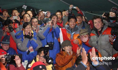 圖:圣火登頂 珠峰大本營內(nèi)激動的面孔