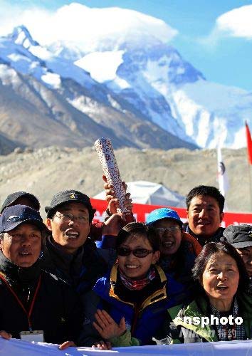 5月8日,北京奧運圣火成功登頂珠穆朗瑪峰,珠峰大本營的工作人員與記者手舉“祥云”慶成功登頂。中新社發(fā) 盛佳鵬 攝
