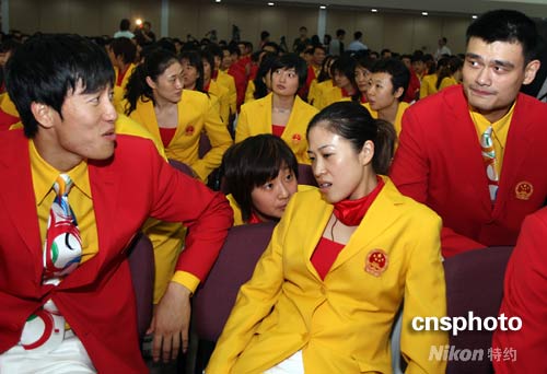 7月25日,參加北京奧運會的中國體育代表團(tuán)在北京正式成立,兩位中國人氣最高的體育明星劉翔與姚明用上海話嘮家常。 中新社發(fā) 任晨鳴 攝