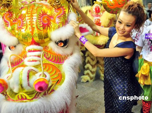 二月二日年初八,香港著名歌星容祖兒擔(dān)任時代廣場“金龍醒獅賀新歲”嘉賓,為六頭醒獅點睛及參花掛紅。中新社發(fā) 譚達明 攝