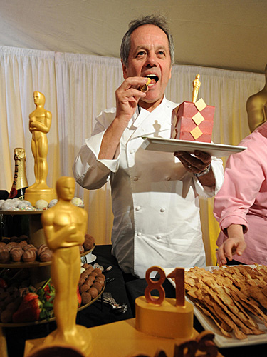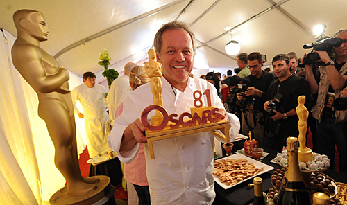 2月19日,負(fù)責(zé)奧斯卡州長舞會(huì)食品供應(yīng)的主廚沃爾夫?qū)て湛耍╓olfgang Puck)在美國加州好萊塢柯達(dá)劇場外的紅地毯上,向媒體展示即將于22日晚奧斯卡州長舞會(huì)的使用食品與裝飾。