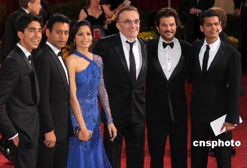 第八十一屆奧斯卡電影金像獎(jiǎng)?lì)C獎(jiǎng)典禮二月二十二日晚在好萊塢柯達(dá)劇場舉行。印度“平民”演員出演的《貧民富翁》如愿以償?shù)貥s獲年度最佳影片大獎(jiǎng),成為當(dāng)晚最大贏家。圖為該片主要演員走過紅地毯。中新社發(fā) 張煒 攝