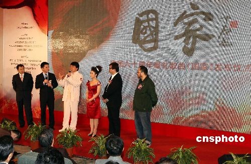 2月28日,國慶60周年獻(xiàn)禮歌曲《國家》在北京人民大會堂舉行發(fā)布儀式。海內(nèi)外華人音樂者全情投入,協(xié)力打造成為這首主旋律歌曲的一大亮點(diǎn)。中國移動將利用無線音樂平臺對其進(jìn)行全程推廣,使這首歌跨越空間的阻隔,向全球華人傳遞信心與力量。國際巨星成龍專程從云南拍片現(xiàn)場趕來參加歌曲發(fā)布儀式,F(xiàn)場通過視頻播放鋼琴巨星郎朗從紐約錄制傳來的創(chuàng)作感言。作曲家金培達(dá)、音樂制作人余秉翰來自香港。參加發(fā)布儀式的還有來自北京的總策劃之一、詞作者王平久和演唱者劉媛媛。中新社發(fā) 杜洋 攝