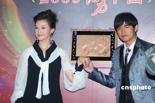 4月18日下午,“魅力相約 巔峰之和”中國北京鳥巢夏季音樂會開篇之作“2009《魅力·中國》”音樂會新聞發(fā)布會在北京舉行。6月30日,宋祖英將攜手歌劇大師多明戈、鋼琴巨星郎朗、流行天王周杰倫,在鳥巢上演一場音樂盛筵。宋祖英透露自己將在這場音樂會上演唱周杰倫的歌曲,直言最愛他的中國風(fēng)。圖為周杰倫和宋祖英一起在鳥巢留下明星手模,象征“《魅力·中國》夏季音樂會”正式啟動。此后,他們兩人的手模也將與奧運冠軍們的手模一起被永久珍藏起來。中新社發(fā) 李學(xué)仕 攝