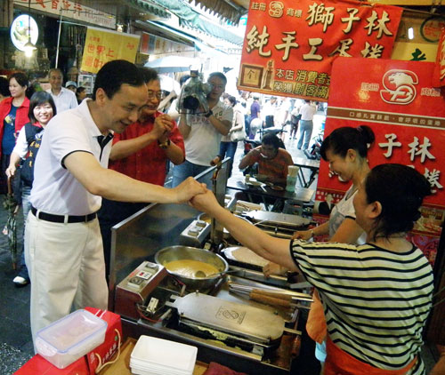 喜歡品嘗小吃的朱立倫努力幫老街拼經(jīng)濟,又到“阿玉麻姥”買了700元的伴手禮,說要在下午的國民黨中山會報與大家分享,后來到廣安宮與鴨肉店老板李光雄等人上香祈福。朱立倫說,他祈求的是“平安”。