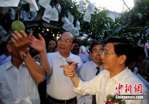 當?shù)剞r(nóng)會代表感謝廣西采購臺南水果。臺南縣南化鄉(xiāng)宏聯(lián)果菜運銷合作社理事長曾永長告訴郭聲琨,采購的這四種水果,價格應聲上揚。芒果一公斤上漲6元新臺幣;芭樂(西番蓮)一公斤上漲11元新臺幣;鳳梨(菠蘿)一公斤上漲8元新臺幣;木瓜每公斤上漲10元新臺幣。如果水果采購能常態(tài)化,對臺灣果農(nóng)將十分有利。