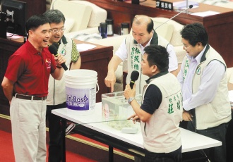 中新網7月15日電 據臺灣《聯(lián)合報》報道,德國章魚哥“保羅”預言世界杯賽事神準讓其全球暴紅,臺北市長郝龍斌昨天至市議會進行施政報告,民進黨市議員莊瑞雄等人,在議場端出2只臺版章魚哥,預測年底臺北市長選情,郝、蘇誰能勝出。