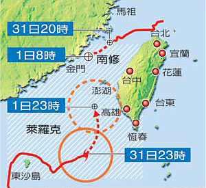 中新網(wǎng)9月1日電 據(jù)臺灣《聯(lián)合報(bào)》報(bào)道,昨晚八點(diǎn)半,臺灣“氣象局”發(fā)布臺風(fēng)“萊羅克”海上警報(bào),今天凌晨兩點(diǎn)半再度發(fā)布陸上警報(bào)。移動速度緩慢的“萊羅克”正在打轉(zhuǎn),今明兩天是最靠近臺灣的時(shí)候,今晚暴風(fēng)邊緣可能在臺灣西南沿海附近。另外,臺風(fēng)“南修”也會影響臺灣部分地區(qū)。