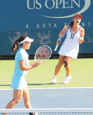 中新網(wǎng)9月9日電 臺(tái)灣《聯(lián)合報(bào)》今日?qǐng)?bào)道說(shuō),“潔然配”的大陸鄭潔及臺(tái)灣詹詠然,昨天勇闖美國(guó)網(wǎng)球公開賽女雙四強(qiáng),追平兩岸女雙組合在大滿貫賽最佳成績(jī),繼續(xù)向前挺進(jìn)。