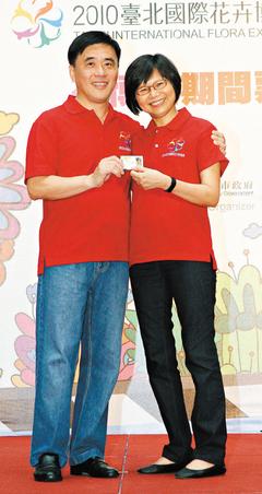 郝龍斌上午并送上一張花博“全期間票”給妻子,作為中秋節(jié)和明年的生日禮物,兩人應媒體要求,甜蜜合影,郝龍斌看起來并未受近來“花系列”風暴影響。