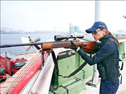 臺(tái)南市警察局相關(guān)單位昨在安平港演練船只遭外籍歹徒劫持勒索,從陸?杖姘献骶热耍^(guò)程逼真。鄭蓮玉經(jīng)特殊任務(wù)警力訓(xùn)練合格,在反劫船任務(wù)演練中擔(dān)任狙擊手,持狙擊槍在頂樓瞄準(zhǔn)歹徒,準(zhǔn)備隨時(shí)配合行動(dòng)射擊,架式十足。