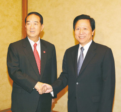 11月1日晚,中共江蘇省委書(shū)記、省人大常委會(huì)主任梁保華在南京金陵飯店會(huì)見(jiàn)了親民黨主席宋楚瑜和副主席張昭雄一行。中共江蘇省委副書(shū)記、省長(zhǎng)羅志軍,海峽兩岸關(guān)系協(xié)會(huì)常務(wù)副會(huì)長(zhǎng)李炳才,中共江蘇省委常委、南京市委書(shū)記朱善璐一同參加會(huì)見(jiàn)。