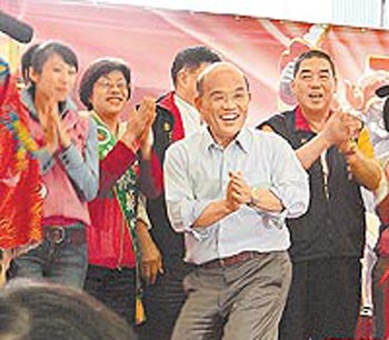 中新網(wǎng)11月14日電 民進(jìn)黨臺(tái)北巿長候選人蘇貞昌13日出席松山霞海城隍廟活動(dòng),受邀與五路財(cái)神一起跳Nobody舞,但他脫了西裝外套,跳出來的舞步卻是Sorry Sorry舞,現(xiàn)場(chǎng)high翻天。