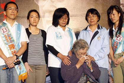 無獨有偶,“招妓”話題如影隨行的扁子陳致中,在其競選總部門口舉辦“來不及說再見,陳水扁坐監(jiān)惜別晚會”,為自己的選舉拉抬聲勢。晚會組織者露出口風:不排除讓扁媽當眾下跪。雖然最終扁媽沒有下跪催票,但扁家人哭成一團的場景仍就是綠營的一大妙招。