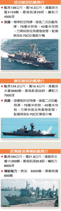 該軍官表示,以臺(tái)灣現(xiàn)有軍艦,最可能是由一艘成功級(jí)艦、一艘拉法葉(康定)艦搭配一艘武夷級(jí)油彈補(bǔ)給艦,及至少兩架直升機(jī),組成護(hù)航支隊(duì)。據(jù)介紹,武夷號(hào)滿載情況下,艦隊(duì)可以獨(dú)立執(zhí)行任務(wù)一百二十天左右。