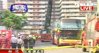 中新網(wǎng)4月24日電 據(jù)臺(tái)灣TVBS報(bào)道,臺(tái)灣信義商圈24日發(fā)生一起嚴(yán)重工安意外,一輛載有25人的廣東旅行團(tuán)游覽車,經(jīng)過(guò)工地時(shí)被37層樓高的起重機(jī)吊臂砸到,導(dǎo)致3人輕重傷和3人死亡。臺(tái)北市長(zhǎng)郝龍斌到意外現(xiàn)場(chǎng)勘災(zāi),對(duì)旅行團(tuán)員表示關(guān)心。