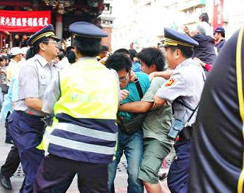 《自由時報》描述稱,學(xué)生嗆聲時,穿著武廟工作人員背心的多名男子突然沖上前,將學(xué)生往外推擠,還有人趁機出手毆打?qū)W生。警方見狀則搶下抗議標(biāo)語,為避免媒體拍到標(biāo)語,還蓋住標(biāo)語,“以跑百米的速度”直奔派出所,并將學(xué)生帶往派出所,馬英九則在安全人員及人群的簇?fù)硐驴焖龠M入武廟揭牌。