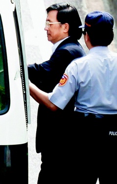 陳水扁在法庭中,對于合議庭訊問和公訴檢察官論告時,表情冷峻、不發(fā)一語枯坐被告席位上;除翻閱公設辯護人為他撰寫的近萬字答辯狀,多數(shù)時間就是專注看著自己答辯書內容,完全不理會審判長提示的函復資料詢問意見、證人供述意見。