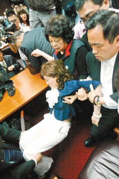 首波沖突發(fā)生在九時(shí)整,兩名女議事人員在藍(lán)營(yíng)“立委”護(hù)衛(wèi)下念議事錄,數(shù)名綠營(yíng)“立委”一擁而上搶資料,瞬時(shí)尖叫、跌撞聲四起,最后在跆拳道選手、藍(lán)營(yíng)“立委”黃志雄護(hù)衛(wèi)下,女“議事”人員才脫困。