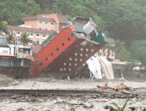 有二十二年歷史的金帥飯店昨天中午十一時三十八分,不敵激濁的山洪,在對岸圍觀群眾驚叫聲中,瞬間倒入知本溪中,附近十棟民宅與商店也被沖走。海岸山脈另一頭的紅葉溫泉全部被埋在土石流里,還好當(dāng)?shù)刂挥袦厝O(shè)施,沒有飯店,不然不堪設(shè)想。