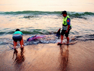 金山派出所昨天清晨5時接獲婦人報案,指出水尾沙灘有海豚擱淺。警員郭光明趕到現(xiàn)場察看,發(fā)現(xiàn)海豚困在沙灘,腹部擦傷滲血;郭與發(fā)現(xiàn)婦人想一起把海豚推回海里,但太重,而且海豚緊張地從噴氣孔噴氣,兩人擔(dān)心弄傷海豚,不敢再動。