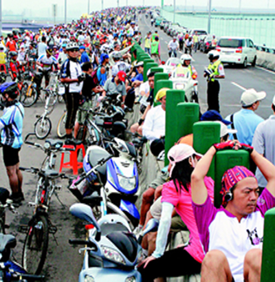縣政府原計(jì)劃將無車日活動(dòng)設(shè)在板橋文化路的捷運(yùn)新埔站,要車友在這里集結(jié)上橋,后來報(bào)名參加車友實(shí)在太多,昨天緊急調(diào)整通車典禮會(huì)場至臺(tái)64線道路的16.3公里處,也就是五股交流道附近。沒想到清晨4時(shí)起就有車友成群結(jié)隊(duì)上橋,卻在16.3公里處被擋駕,他們耐心等候7時(shí)30分通車典禮,沒想到因人太多,近七萬車友和愛車就硬被堵在高架橋上。