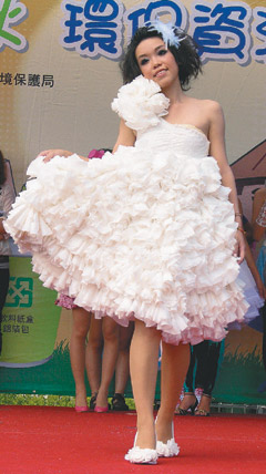 模特兒身上穿的有統(tǒng)一發(fā)票制成的小洋裝,也有用廢面膜、廢雨傘布、廢布、舊童裝拼成的美麗衣裳,連包裝尼龍繩也可以制成馬甲,飲料罐成為皮帶、飾物,令觀眾驚艷!環(huán)保局長劉伯舒形容,這是垃圾變黃金的最好展示。